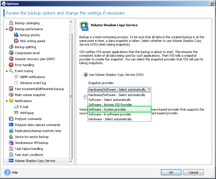 Problemin çözüm yolu ise ayarlardan  Acronis VSS servisi yerine Microsoft VSS servisini seçmek. Acronis Advanced Server 10 da ise ” do not use VSS service” seçmeniz gerekiyor.