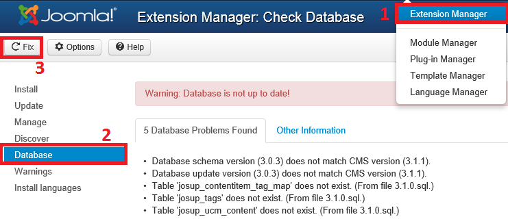 Extension Manager – Database ve sonrasında Fix butonuna tıklanır.