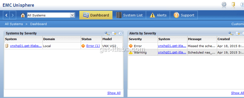 EMC VNX serisi depolama birimleri üzerinde oluşan olaylara Unisphere Dashboard’ undan ulaşabiliyoruz.