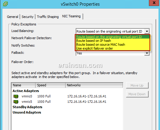ESXi Server yapılandırılması sırasında, kafa karıştıran konulardan birtaneside maksimum performans ve kararlılık için hangi Network Load Balancing seçeneğinin aktif edileceğidir. Virtual Standart Switch ile toplamda dört adet uygulanabilir politika bulunmaktadır.