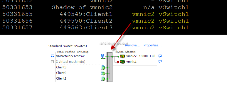 Power On durumuna göre 2 adet VM tek bir fiziksel kartı kullanacak, 1 VM diğer ethernet kartını kullanacaktır. Bunu esxtop yardımıyla gözlemleyebiliriz.