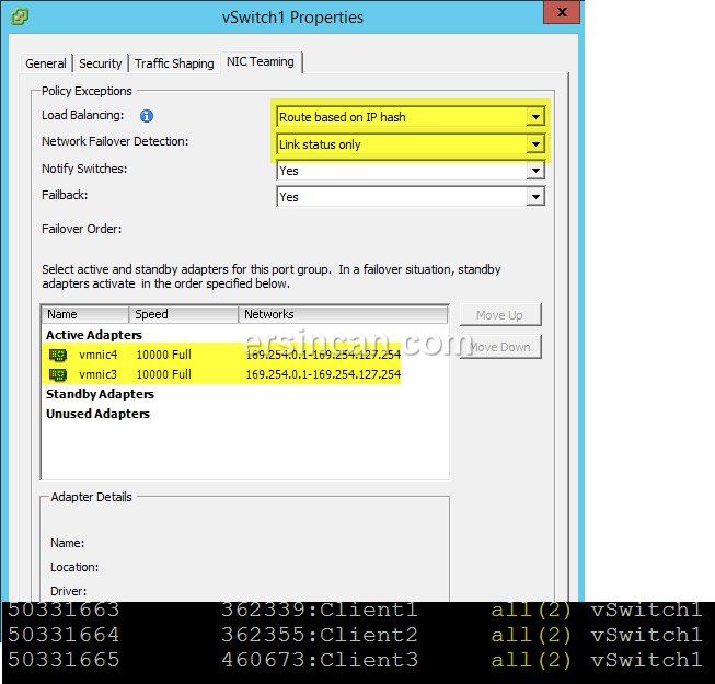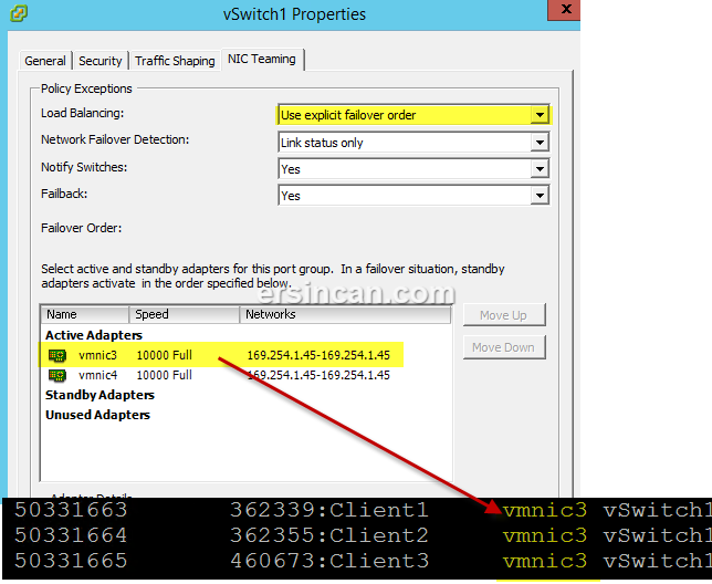 Lütfen Dikkat !!!! : Route Based IP Hash politikası için seçmiş olduğunuz uplink portlarını asla aralarında STACK yapısı olmayan iki farklı switch’e bağlamayınız. Çünkü bu port grubu tek bir hayali MAC adresine sahip olacağından dolayı, iki farklı switch’in CAM tablosunda aynı MAC adresinin yer alması paketlerin kaybolması ile sonuçlanacaktır. Diğer önemli husus ise Fail Over konfigurasyonu seçeneklerinden mutlaka “Link Status Only” seçilmelidir.