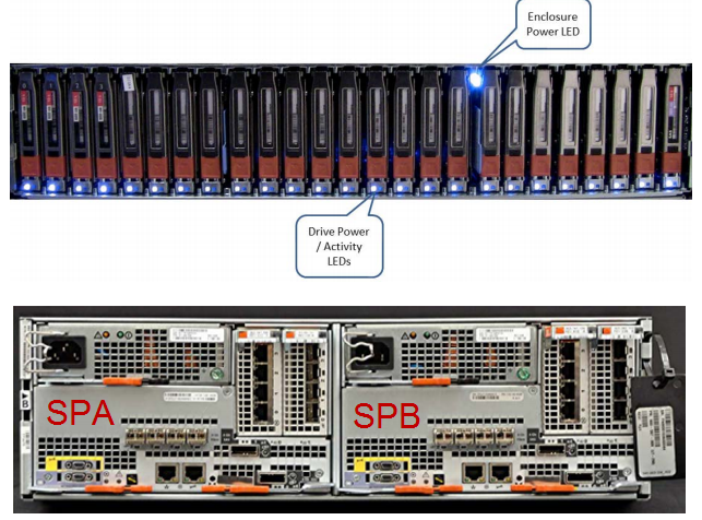 Storage Processor (SP) : Her depolama biriminde 2 adet bulunur ve “SPA” ve “SPB” olarak nitelendirilir.  Raid işlemleri, Okuma – Yazma olaylarının yönetimi, Fiber Channel ve ISCSI portlarının kontrolü bu birimin sorumluluğundadır. Storage Processor ‘lerin birinde oluşan teknik problemde, diğeri bütün görevleri tek başına yerine getirmeye devam eder ve hizmette her hangi bir kesinti meydana gelmez.