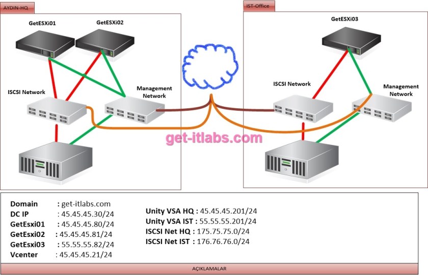 Senaryomuz gereği Aydın Merkez datacenterımız için 2 adet ESXi sunucusu ve bir adet Unity VSA, disaster senaryomuz içinse IST Ofisimize 1 Adet ESXi ve bir Adet Unity VSA kurulumu gerçekleştireceğiz. Sonrasında ise NFS, Vvol, Vasa gibi özelliklerimizin kullanımını anlatacağız. Bağlantı topolojimiz aşağıdaki gibi olacaktır,