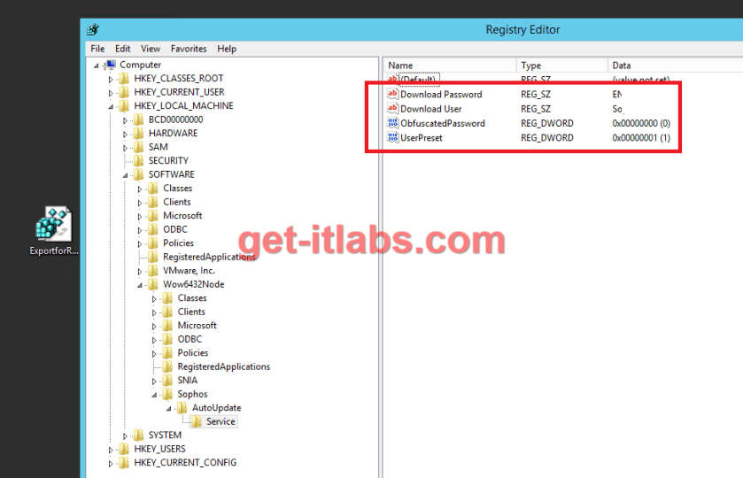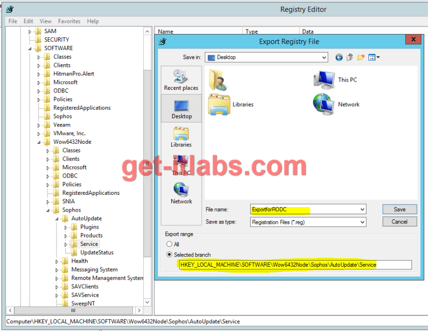- Mevcut DC ‘leriniz üzerinde “HKEY_LOCAL_MACHINE\SOFTWARE\Sophos\AutoUpdate\Service” yoluna gidiyorsunuz ve buranın bir exportunu alıyorsunuz.