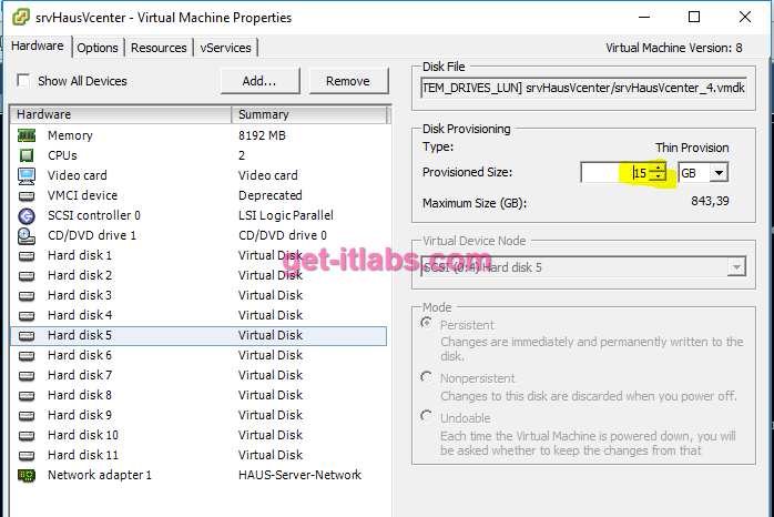 Dolu olan diskimizin karşılığını aşağıdaki listeden buluyoruz ve vClient yardımıyla disk boyutunu güncelleştiriyoruz.