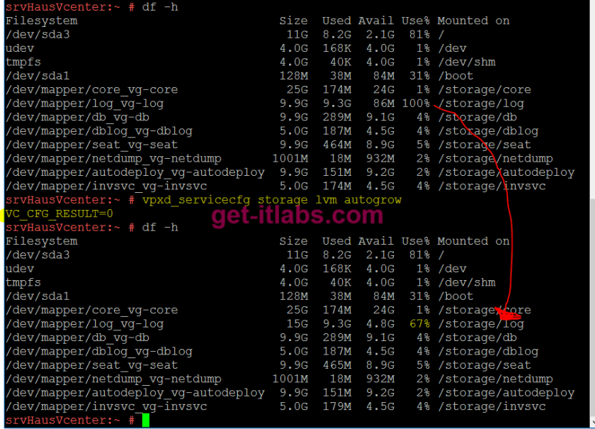 vpxd_servicecfg storage lvm autogrow” komutunu çalıştırıp biraz bekliyoruz. İşlem başarılı ise “VC_CFG_RESULT=0” sonucu dönecektir. Disklerimizin durumunu yeniden ” df -h ” komutu ile kontrol ederek değişikliğini gözlemliyoruz.