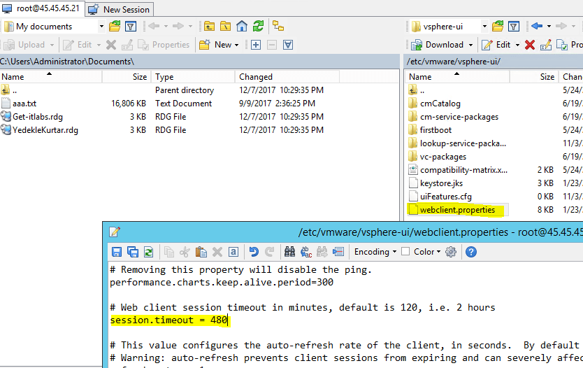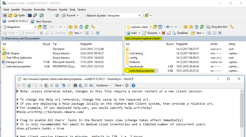 Vsphere 6 ve üzeri sürümler için VCSA ‘ya Winscp ile bağlanıyoruz ve /etc/vmware/vsphere-client/ yolundaki webclient.properties dosyasını açıyoruz.