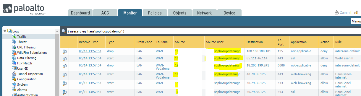 Fakat kullanıcının loglarına firewall tarafından baktığımda durum farklıydı.