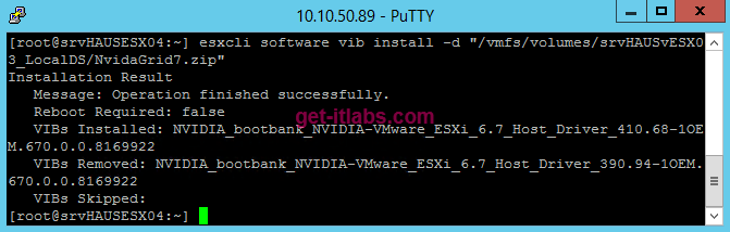 Sonrasında ESXi sunucumuzu maintance moda alıp “esxcli software vib install -d “/vmfs/volumes/srvHAUSvESX03_LocalDS/NvidaGrid7.zip” komutunu çalıştırıyoruz.