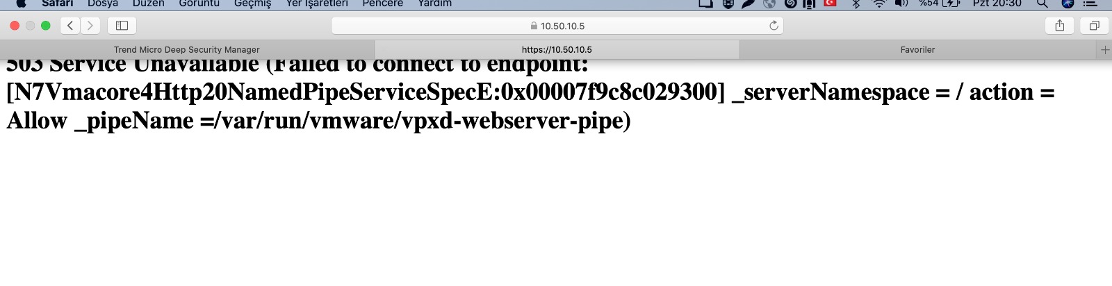 Hatanın kaynağını araştırmak için ilk adım Vcenter ‘a bağlanayım dedim Bingo “503 Service Unavailable (Failed to connect to endpoint: [N7Vmacore4Http20NamedPipeServiceSpecE:0x00007fb7d00200a0] _serverNamespace = / action = Allow _pipeName =/var/run/vmware/vpxd-webserver-pipe)” yazan kocaman uyarı mesajı.