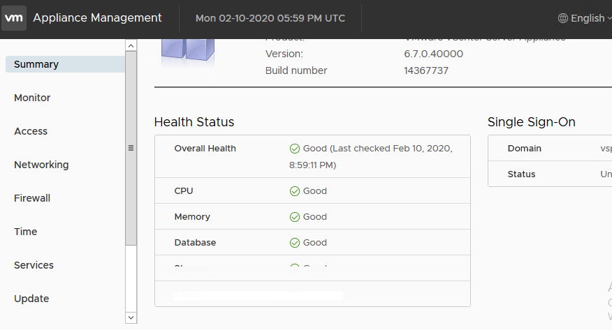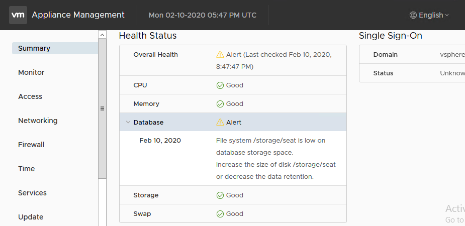 Servisleri kontrol etmek için 5480 portundan Vcenter Management konsoluna login olduğumda Database bölümünden hatalar geldiğini farketmemek imkansızdı.
